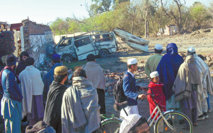 People gather near a detonated explosive-laden van at an army compound in Bannu Cantonment, Pakistan's Khyber Pakhtunkhwa Province, on Wednesday. Twelve civilians and six terrorists were killed and 32 injured when terrorists targeted the cantonment area.