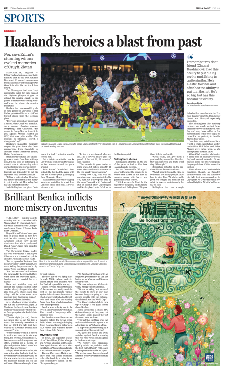 MANCHESTER, England-Erling Haaland's stunning acrobatic finish to beat his old club Borussia Dortmund 2-1 sparked comparisons from Manchester City manager Pep Guardiola with his mentor Johan Cruyff.