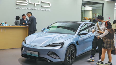 Customers inspect a BYD Seal sedan in a salesroom in Shanghai in December.