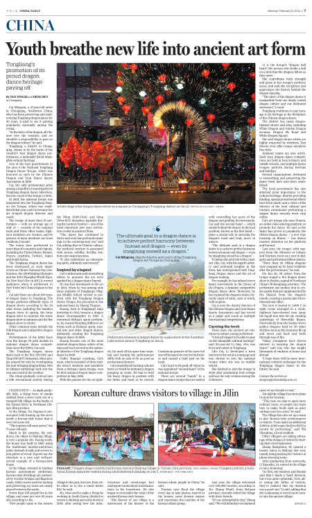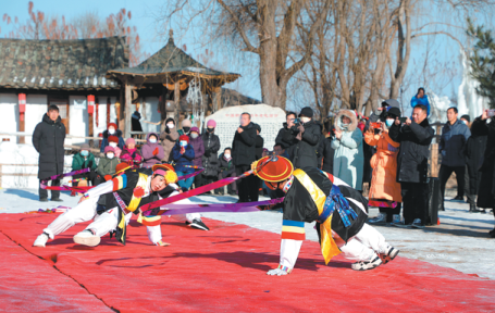 Villagers perform a traditional Korean dance for visitors during a folk festival in Bailong on Jan 5.