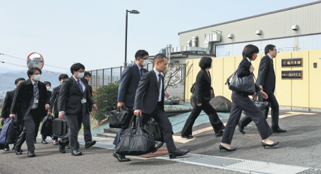 Staff members of Japan's Health Ministry enter a factory of Meitan Honpo, subsidiary of Kobayashi Pharmaceutical, for an on-site inspection in Kinokawa, Wakayama Prefecture, on Sunday.