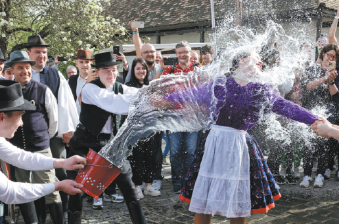 A man splashes water onto a woman as part of the traditional Easter celebrations in Holloko, a UNESCO World Heritage Site in Hungary, on Monday.