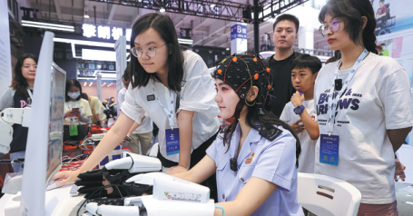 A woman tests a multimodal brain-computer interface system at the 2023 World Robot Conference in Beijing. The capital is at the national forefront of BCI.