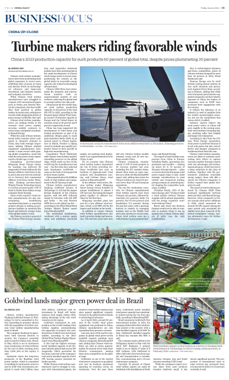 Chinese wind turbine manufacturers have been accelerating their global expansion in recent years, exhibiting their prowess at home and abroad, driven by technological advances and large-scale investment, said industry experts and company executives.