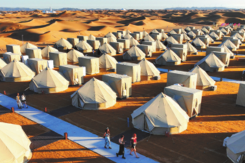 Camping tents in July in the Tengger Desert in Zhongwei, Ningxia Hui autonomous region, a popular destination for nature lovers, provide overnight shelter and the opportunity to witness sunrises and enjoy stargazing.