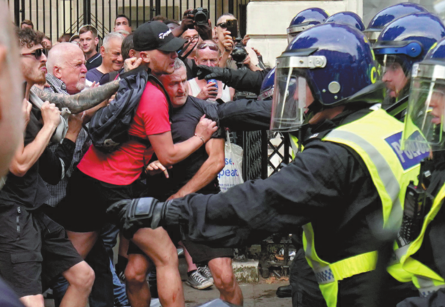 Protesters scuffle with police officers during the "Enough is Enough" protest in London, on Wednesday, following the fatal stabbing of three children on Monday in Southport.