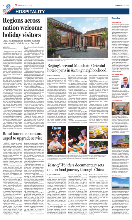 Hospitality group Marriott International shared its latest achievements in three key areas: new brands and experiences, loyalty programs and sustainability initiatives at a session of the 2024 China International Fair for Trade in Services in Beijing. "In recent years, Marriott International has continued to create personalized experiences that center around the evolving needs of travelers, who are now more focused on experiences and connections than ever before," Betty Tian, vice-president of marketing, communications, premium and select brands for China at Marriott International, said at the event. "With a presence of over 560 hotels across 24 brands in China, the Marriott Bonvoy travel program collaborates with strategic partners such as Cathay Pacific, Mercedes-AMG PETRONAS F1 Team, and the Rolex Shanghai Masters to create once-in-a-lifetime experiences in food, sports, entertainment and lifestyle, enriching life by connecting people to the people, places and passions they love."