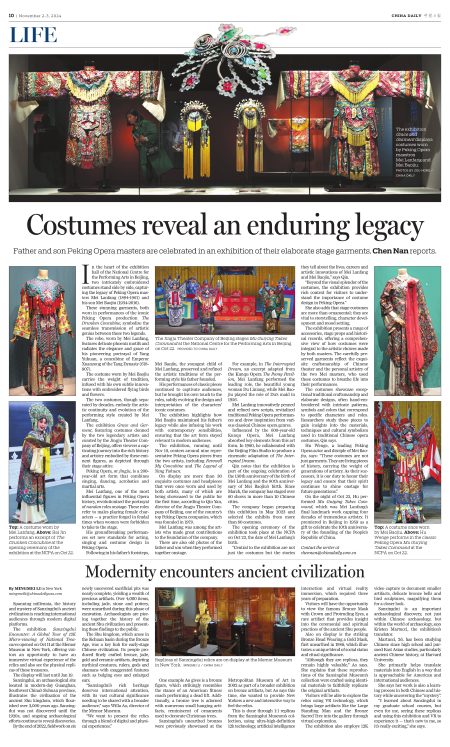 Qin notes that the exhibition is part of the ongoing celebration of the 130th anniversary of the birth of Mei Lanfang and the 90th anniversary of Mei Baojiu's birth. Since March, the company has staged over 60 shows in more than 10 Chinese cities.