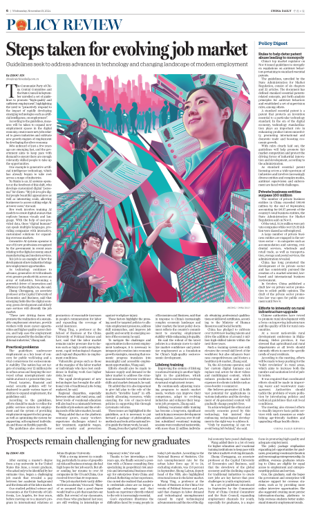 The Communist Party of China Central Committee and the State Council in September unveiled a set of guidelines to promote "high-quality and sufficient employment", highlighting the need to "proactively respond to the impact of rapidly developing emerging technologies such as artificial intelligence, on employment".