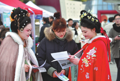 Company members dressed in traditional costumes distribute recruitment materials to a job seeker on Friday at a career fair in Luoyang, Henan province. Hundreds of employers offered a wide range of job opportunities and services such as employment and entrepreneurship policies, startup loans, and legal aid for labor relations.