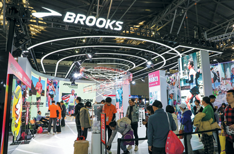 Visitors check out products at Brooks' exhibition booth during the 2023 Shanghai Sports Show on Nov 24, 2023.