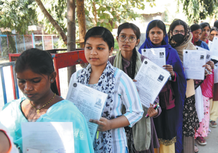 Examinees stand in a queue before appearing for the Bihar board class 12 intermediate examination at a high school in Patna, in India's eastern state of Bihar, on Tuesday.
