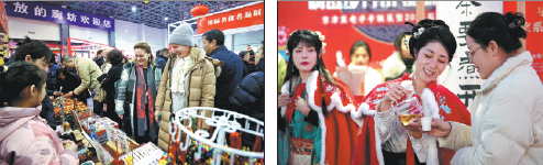 Left: Members of the diplomatic corps select products at a Spring Festival event in Langfang, Hebei, on Jan 23.Right: A visitor samples a drink at the Beijing-Tianjin-Hebei time-honored brands exhibition in Shijiazhuang, Hebei, on Nov 30.