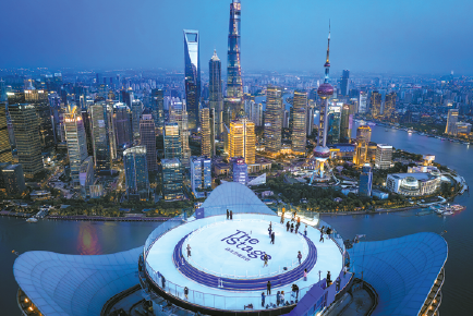 People gather at the top of Shanghai's Sinar Mas Plaza on Monday. The Stage observation deck opened to the public on Tuesday. Visitors can enjoy a 360-degree view of the city's captivating skyline from a height of 320 meters.