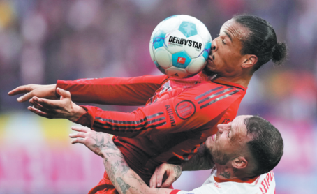 Bayern's Leroy Sane takes a ball to the face as he is challenged by Leipzig's David Raum during a German Bundesliga match at the Red Bull Arena in Leipzig, Germany, on Saturday.