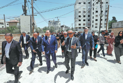 Members of a diplomatic delegation from the European Union walk near the eastern entrance of the Jenin camp during a visit to the occupied West Bank on Wednesday. The Palestinian Authority accused Israeli forces of firing on diplomats as they assess the dire humanitarian situation in the city, releasing video of two soldiers aiming rifles at a group of people.