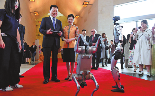 Chinese Ambassador to the United States Xie Feng interacts with a robotic dog at the premiere of the documentary My China Album — My China Footprints and the Glimpses of Modern China show, on Wednesday at the Chinese embassy in Washington, DC.