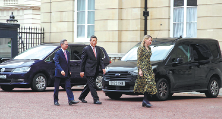 Vice-Premier He Lifeng (center) arrives at Lancaster House in London on Monday for the first meeting of the China-United States economic and trade consultation mechanism. Editorial, page 8