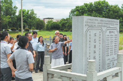 Wang Xuan points to a memorial located at the former Japanese army's bacteriological warfare unit in Yiwu, Zhejiang province, on July 8.