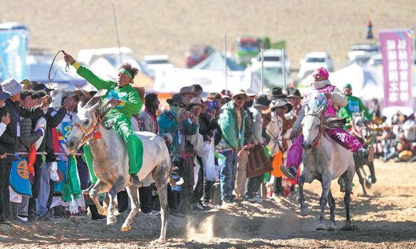 Participants compete in a horse racing event, known in the Tibetan language as "Gar Chaqin" in Gar county, Ngari prefecture, Xizang autonomous region, on Saturday. The event features equestrian performances.