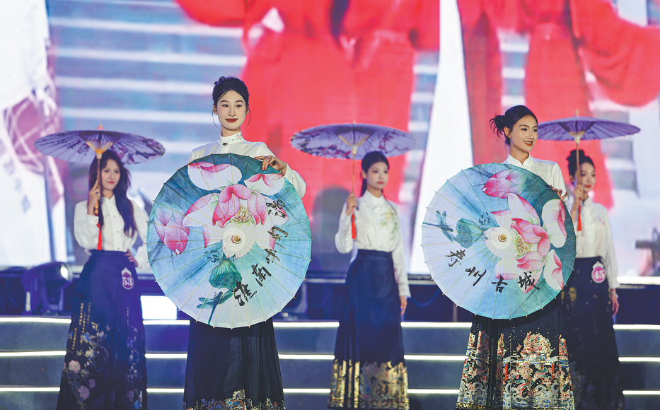 Contestants wearing traditional hanfu costumes compete in the 2025 Miss Tourism World China Finals in Huainan city, Anhui province, on Saturday. A total of 60 participants from 20 regions across the country showcased their charm through garment displays and talent performances at the event.