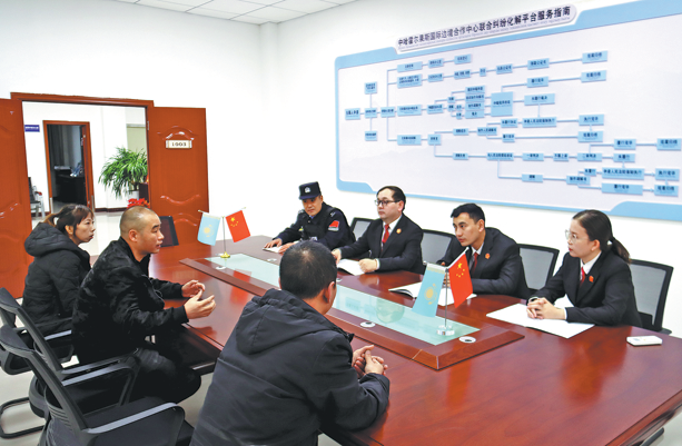 Workers from Horgos People's Court and from a China-Kazakhstan joint dispute resolution platform mediate a case in Horgos, Xinjiang Uygur autonomous region, in December last year.