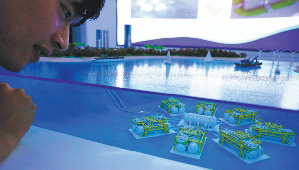 A visitor takes a close look at a scale model of undersea data pods for a commercial undersea data center in Lingshui, South China's Hainan province, on Thursday. The project, launched in 2022, is part of China's quest to harness marine resources for next-generation computing power. See story, page 5