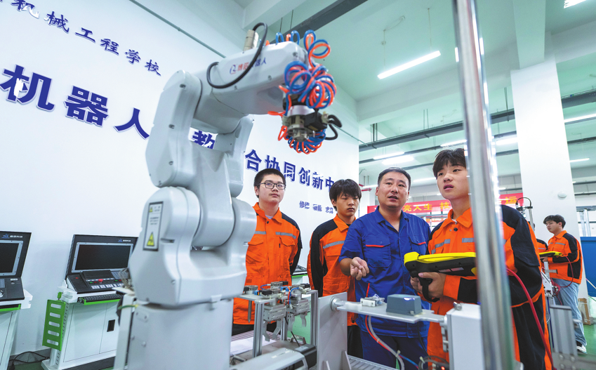 At a mechanical engineering school in Wuhu, Anhui province, students train on industrial robots under teacher supervision.