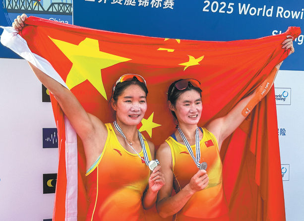 Chen Yunxia (right) and Zhang Ling pose with their silver medals after finishing second in the women's Olympic-class double sculls during the 2025 World Rowing Championships in Shanghai.