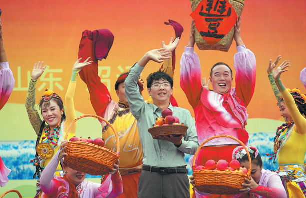 Pomegranate grower Liu Yuan (center) hits the stage with performers in promoting the produce during a festival activity in Zhaoyuan, Shandong province, on Sept 23.