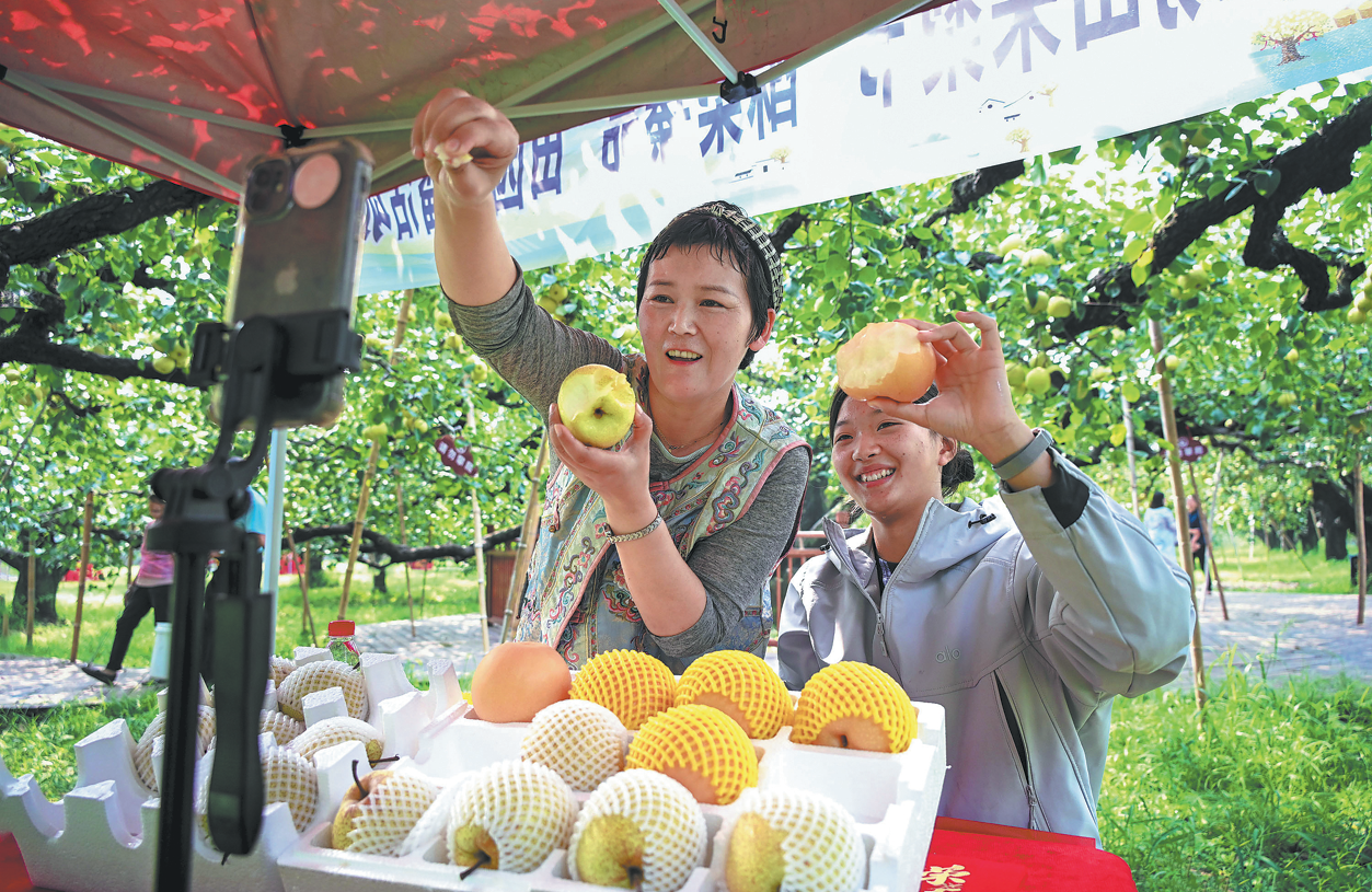 Growers promote pears during a livestreaming session at an orchard in Dangshan, Anhui province, on Sept 13.