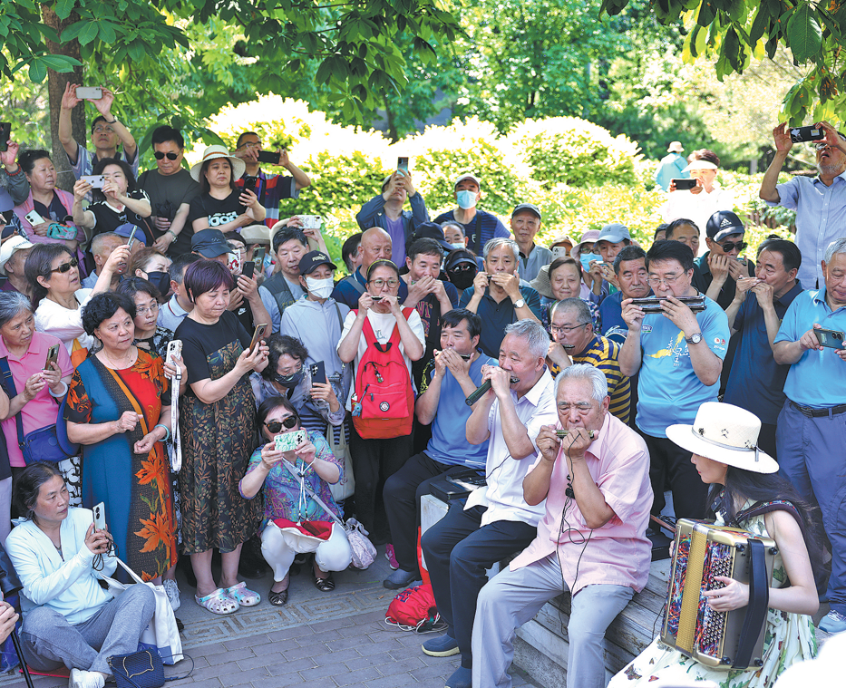 Wang Zhixiang and Fan Kaijian (front row), dubbed "Harmonica Grandpas" by online fans, performs a string of children's songs while drawing fans to join the performance in Beijing in May last year.