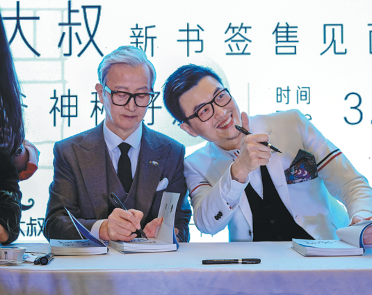 Grandpa Beihai and his son, Yang Kai, who goes by the online name Uncle Mona, sign books during a session in March 2019.