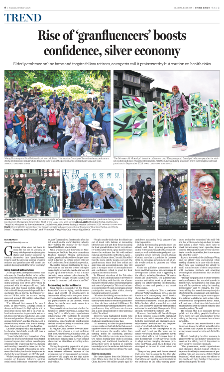 Growing older does not have to mean life has lost its vibrancy, as many elderly people are joining the digital and internet economy by turning themselves into "granfluencers".Experts said the growing number of senior netizens and granfluencers will benefit the nation's development of the "silver economy".