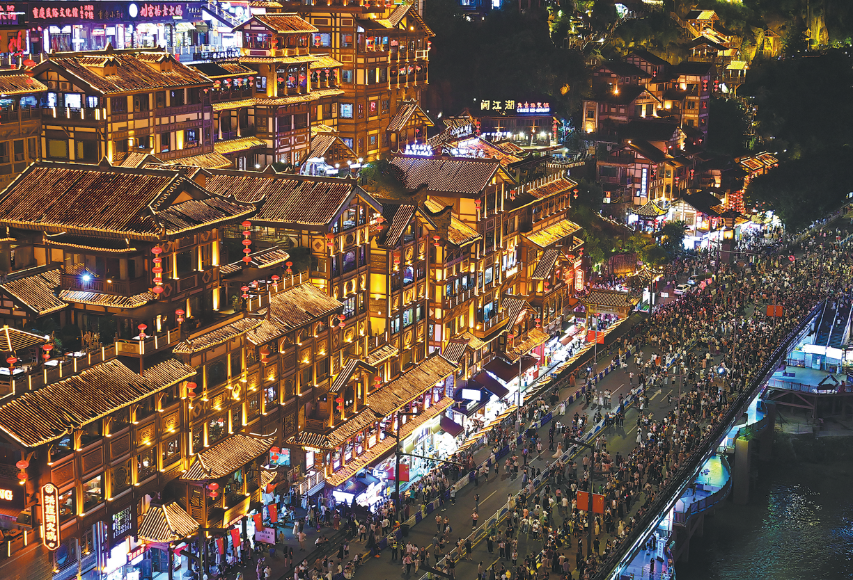 Visitors throng the bustling Hongyadong scenic area in Chongqing's Yuzhong district on Monday evening. The area is a major tourist attraction, drawing crowds with its vibrant illuminations and cultural performances. According to Chongqing tourism authorities, Hongyadong received over 698,000 visitors during this year's five-day May Day holiday.