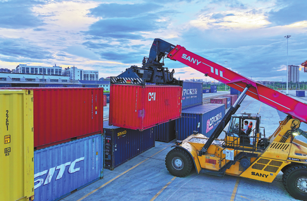 Containers for the China-Europe Railway Express service are hoisted in Tongjiang, Heilongjiang province, on July 25. The station, near the China-Russia border, serves as a transfer hub for trains of different gauges in China and Russia.