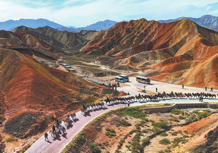 A camel caravan traverses the stunning Danxia landforms in Zhangye, Gansu province, on Tuesday. This caravan has been retracing the ancient Silk Road since August from Barkol Kazakh autonomous county, Xinjiang Uygur autonomous region.