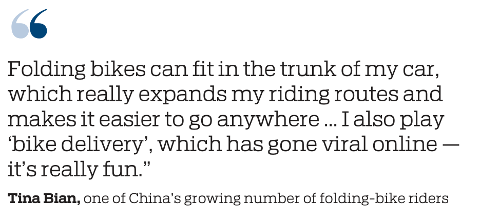 Tina Bian, 31, joined China's growing community of folding-bike riders this summer when she purchased a Dahon P10 for 4,700 yuan ($658).