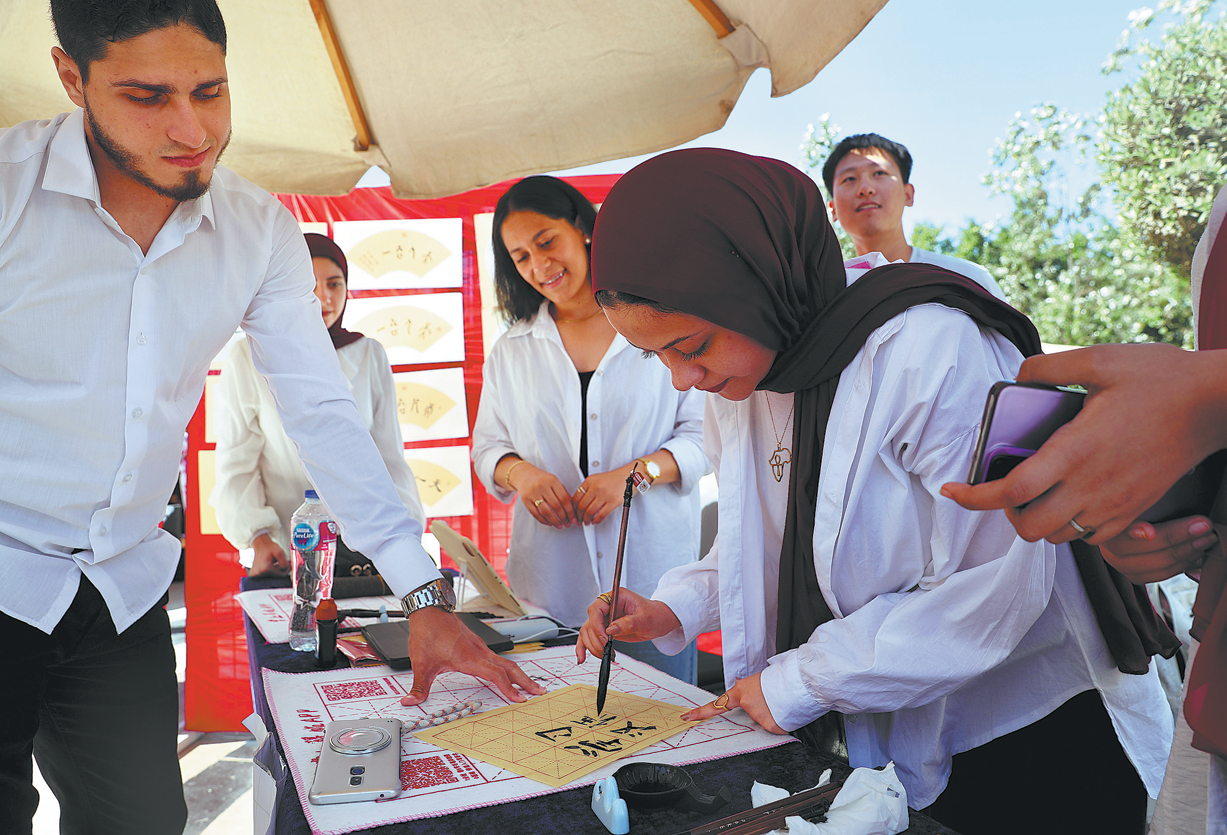 A student tries her hand at calligraphy during a Chinese culture festival held at Badr University in Cairo, Egypt, on Monday. The festival featured Chinese calligraphy and paper-cutting workshops, martial arts performances, an ethnic costumes show, and booths serving traditional snacks such as dumplings and steamed buns, attracting numerous students and teachers.