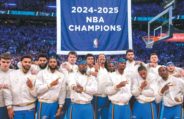 Oklahoma City Thunder players pose with their rings in front of the championship banner before tip-off in their season opener against the Houston Rockets at Paycom Center on Tuesday in Oklahoma.