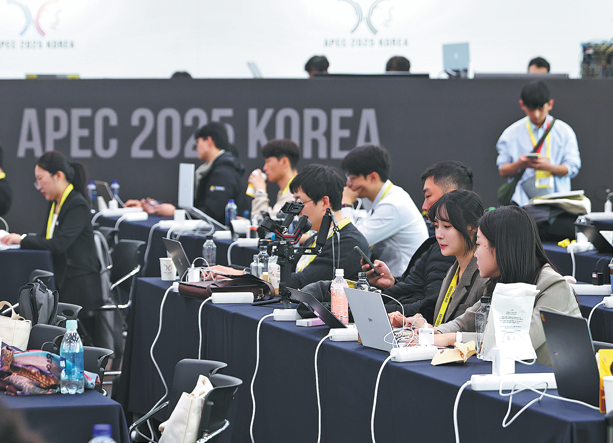 Journalists work at the international media center set up for the 32nd APEC Economic Leaders' Meeting in Gyeongju, the Republic of Korea, on Tuesday. The meeting will run from Friday through Saturday.