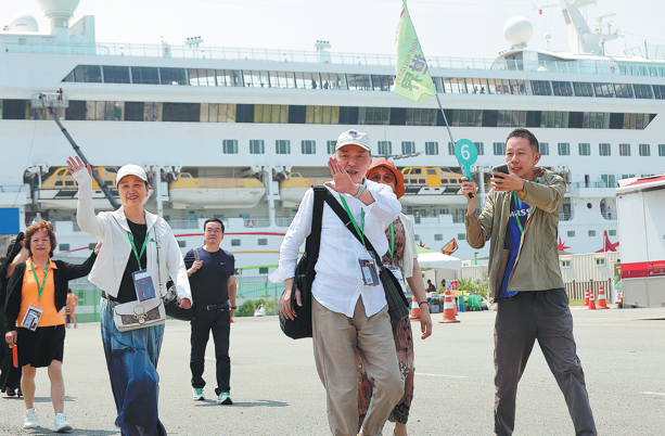 Chinese tourists from the cruise ship Blue Dream Melody arrive at Busan Port on June 12, 2024.