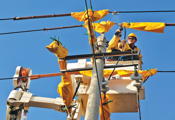 An employee from State Grid Pishan in the Xinjiang Uygur autonomous region conducts live operations on a 10-kilovolt transmission line, helping facilitate rural power grid renovation and upgrading in Hotan prefecture.