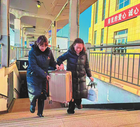 A staff member (left) of China Railway Taiyuan Group helps a passenger board a train at Shuozhou Railway Station in Shanxi province. The station is boosting its services through an initiative named "Spring of the North". The brand-building effort integrates "warmth" and "precision" into the whole service process to meet the travel requirements of passengers, including ticket purchase, check-in, luggage movement, and assistance for special needs such as pickup and drop-off at platforms.