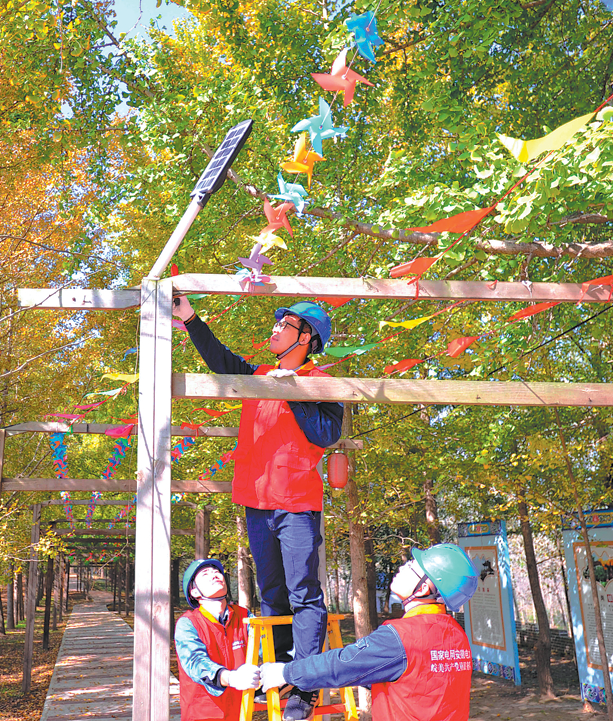 Staff members of Bogang Power Supply Service Station under State Grid Mingguang in Anhui province check power supply lines and lighting equipment among Bogang's ginkgo trees. They aim to ensure sufficient power supply for the ginkgo-viewing period in this "No 1 Ginkgo Township in Anhui", powering tourist accommodations, road lighting, as well as local cultural and tourism activities.