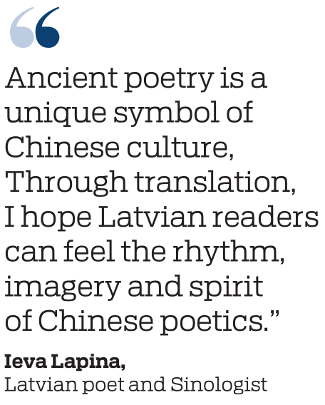 "Ancient poetry is a unique symbol of Chinese culture," Lapina said in a recent interview. "Through translation, I hope Latvian readers can feel the rhythm, imagery and spirit of Chinese poetics."