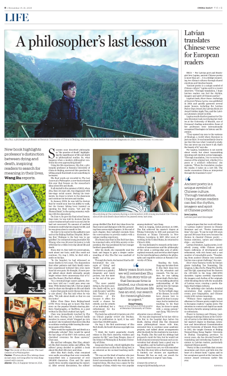 Lapina hopes that her work will deepen Latvian readers' interest in Chinese literature and art. "Poetry transcends time," she says. "It can be read 100 years ago and 100 years from now, because the themes in classical Chinese poetry — human existence, nature and relationships — are timeless."