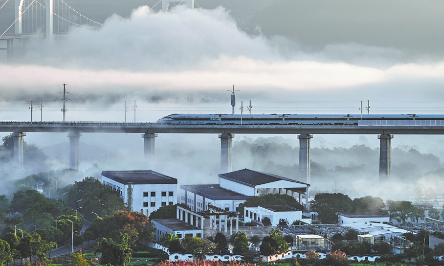 A high-speed train passes over a bridge along the Panzhou-Xingyi High-Speed Railway in Southwest China's Guizhou province on Friday. The new high-speed railway, which opened that day, stretches 99 kilometers, connecting Panzhou with Xingyi and is designed for speeds of 250 kilometers per hour. The inauguration of the new line marks a historic moment, signaling a new chapter of growth for the province and unlocking tourism potential for the picturesque region, after overcoming substantial construction challenges of traversing complex terrain.