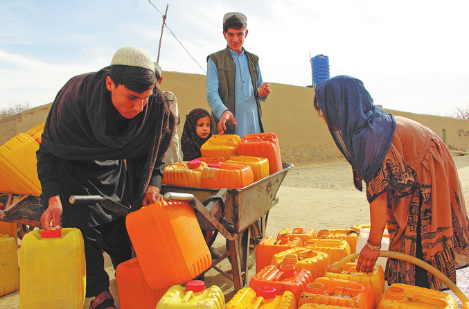 An Afghan boy fills containers from a makeshift water pump in Kandahar, Afghanistan, on Thursday. The EU warns that over 21 million Afghans lack access to safe drinking water.
