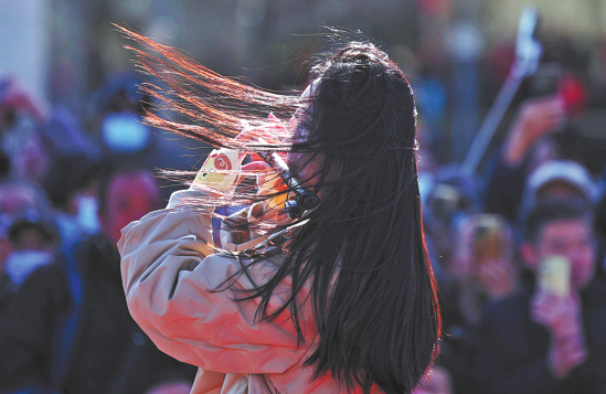 With her hair fluttering in the winter wind, Sun concentrates on her performance at Tianqiao Square in Beijing.